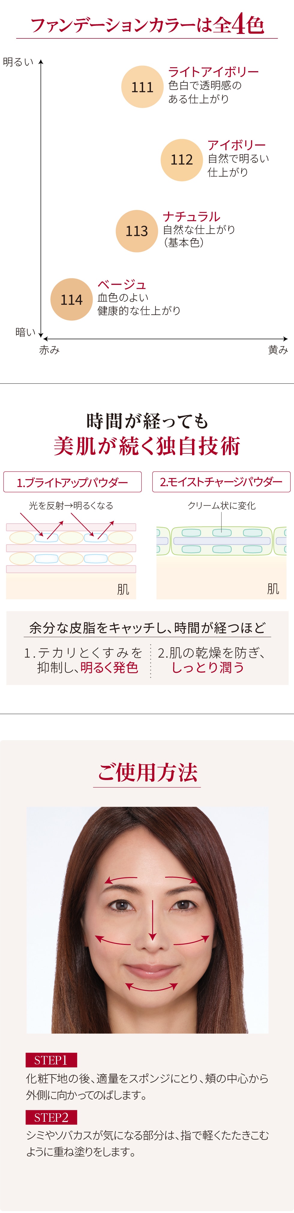 ・独自技術「ブライトアップパウダー」「モイストチャージパウダー」が、にじみ出る余分な皮脂をキャッチして、テカリとくすみを抑制します。時間が経っても、自然な明るさ・潤い感のある仕上がりです。